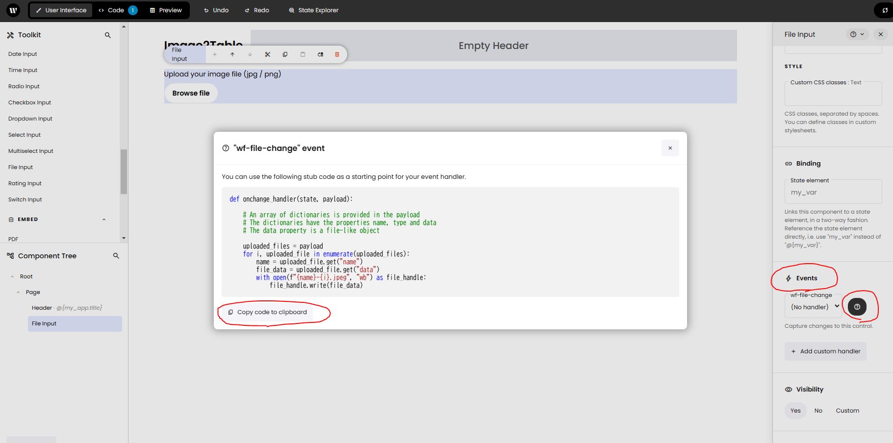 Now, click "Code" in the upper left of the screen to display the code. Leave only initial_state and delete the rest. Paste the code you copied to the clipboard earlier there, and you will be able to select the function in wf_file_change of the "Event" of the "File Input" component, so select it. With these operations, wf_file_change will be called when you upload a file.