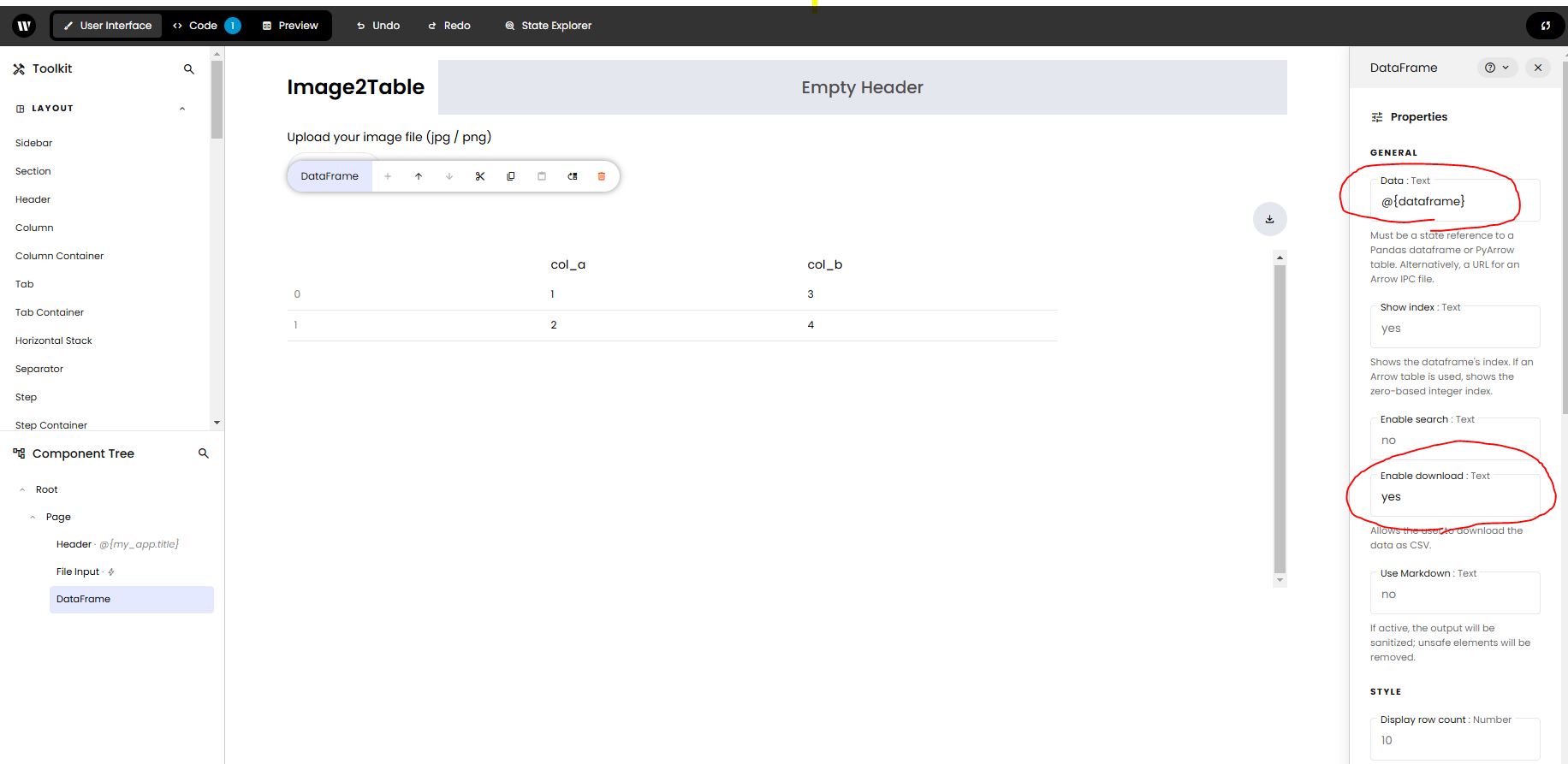 Then, process the binary data of the uploaded file, extract the table data, and display it as a Dataframe. Drag and drop the DataFrame component onto the screen in "User Interface", enter @{Dataframe} in the "Data" property on the right side of the screen, and set "Enable download" to Yes.